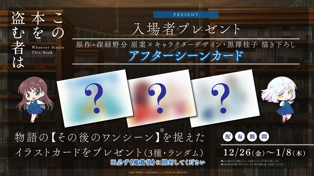 ・第2弾入場者プレゼントは、作中で深冬たちが冒険する“マジックリアリズム小説”『繁茂村の兄弟』と“ハードボイルド小説”『BLACK BOOK』を両面にデザインした掛け替えブックカバーを配布 ・第3弾入場者プレゼントは、表面は“スチームパンク小説”『銀の獣』、裏面は作中に登場する書店「Booksミステリィ」をイメージしたデザインの掛け替えブックカバーを配布